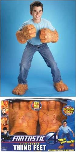 These Thing Feet have earthquake stomping sounds! Put these Electronic Thing Feet on, and it's Ben Grimm to the rescue! The fateful accident in space turned Ben Grimm into The Thing - a superhuman, super strong creature with an irreversible orange-colored rocky exterior. After many tests Reed has yet to find a weight that The Thing can't handle. Many people find him unsightly, but Ben struggles to maintain his sense of humor and honor - because under that tough exterior lies an ever loving heart of gold. Fits up to Men's Size 5. Requires 4 "AA" batteries (included).